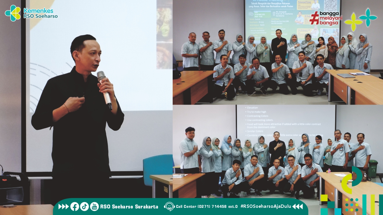 Sukoharjo (30/10) – Sub Tim Kerja Pendidikan & Pelatihan menyelenggarakan "In House Training (IHT) : Teknik Mengolah dan Menyajikan Makanan yang Aman, Sehat dan Berkualitas untuk Pasien" untuk Nutrionis atau Dietisien dan Tenaga Penjamah Makanan pegawai Instalasi Gizi RSO Soeharso Sebagai narasumber Muhammad Firman, Ali Rosjidi, Yekti Herinawati, dan moderator Purtiantini. In House Training dibuka oleh Plt. Direktur SDM, Pendidikan dan Penelitian, Dina Sintia Pamela, S.Si,