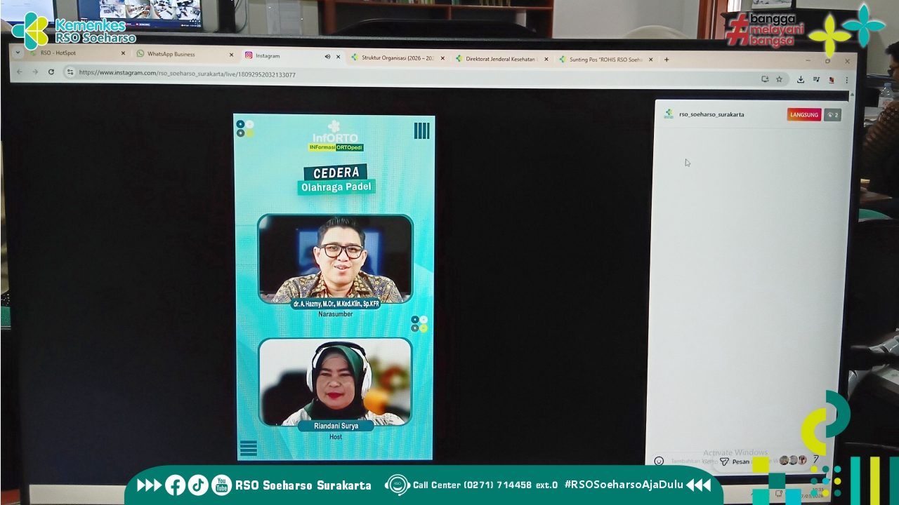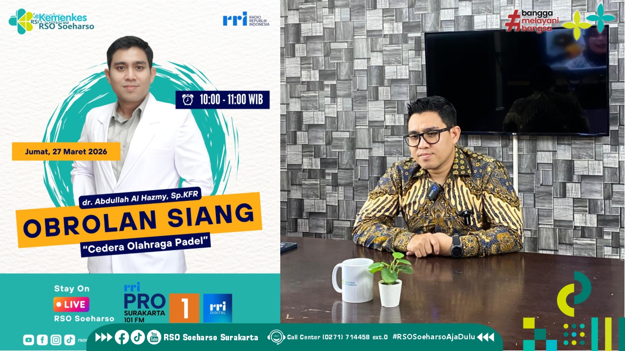 Sukoharjo – RSO Soeharso Surakarta memberikan edukasi dalam Obrolan Siang di Siaran RRI, Jum'at, 27 Maret 2026 dengan tema "CideraOlahraga Padel" dan narasumber dr. Abdullah Al Hazmy, M.Or., M.Ked.Klin., Sp.KFR. Olahraga bertujuan untuk kesehatan dan rekreasional, jangan sampai olahraga justru menjadikan cedera dan menyebabkan terganggu secara aktivitas. Padel tennis sedang naik daun! Perpaduan antara tenis dan squash ini memang seru dan adiktif, tapi intensitas permainannya yang cepat dan ruang lapangan yang sempit menyimpan risiko cedera tersendiri.